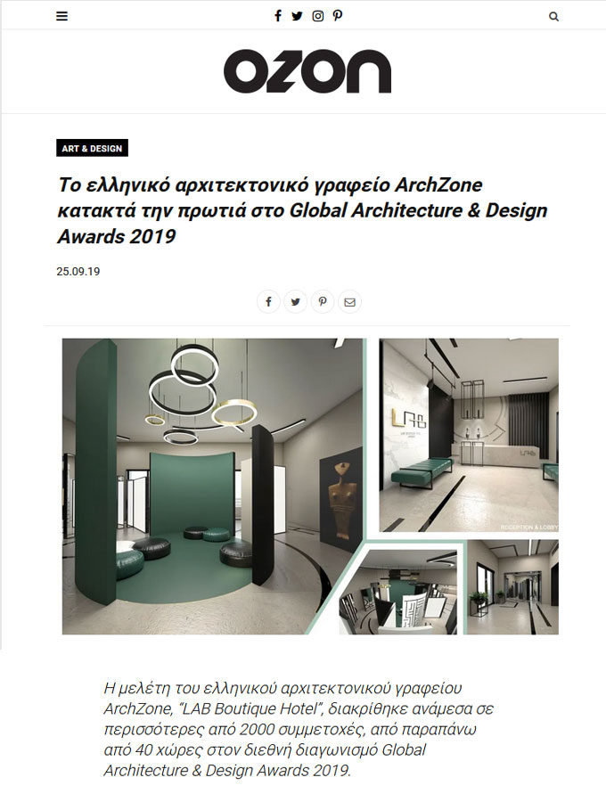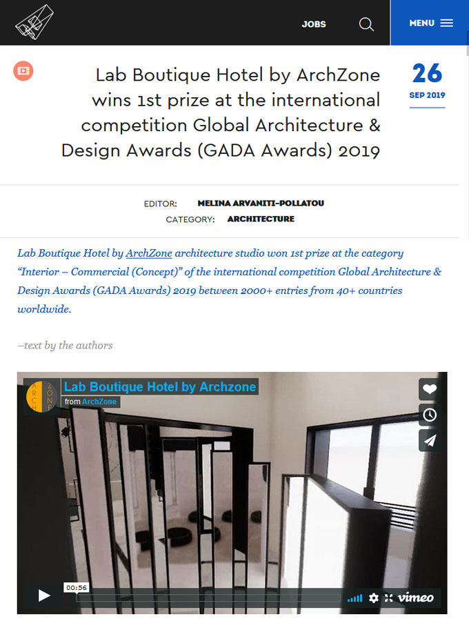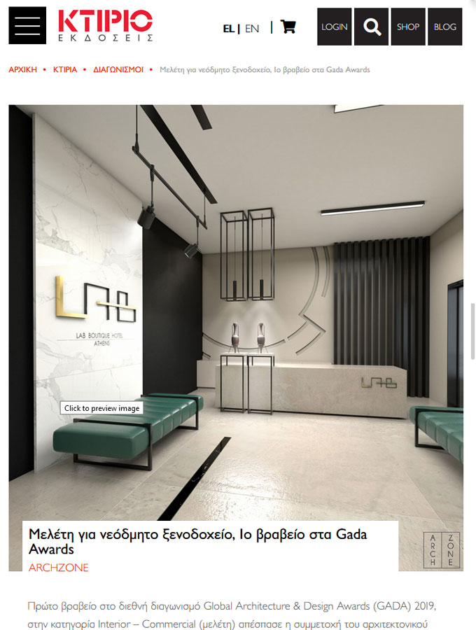 Αναφορές του 1ου βραβείου για το LAB Boutique Hotel στην κατηγορία Interior – Commercial (Concept) του διεθνούς διαγωνισμού Global Architecture & Design Awards (GADA Awards) 2019!